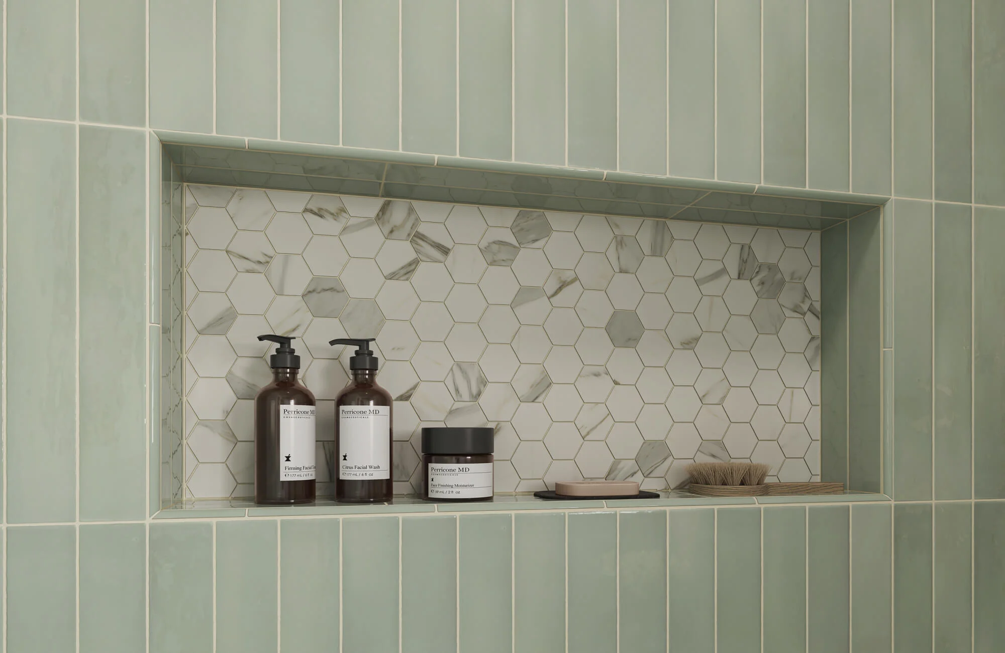 Для небольшой ниши в ванной не требуется много материалов. Остатки плитки станут элегантным элементом, который выделит дизайн.