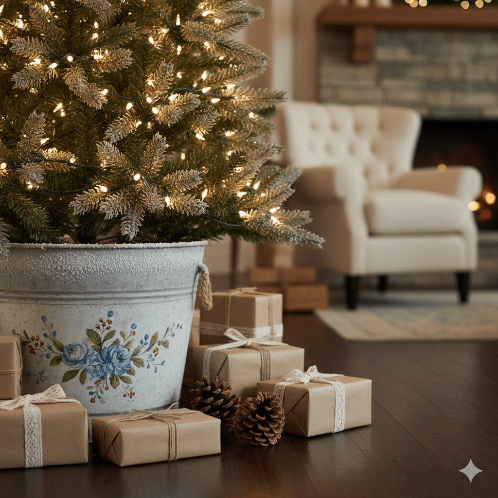 Для стиля винтаж или прованс можно использовать оцинкованное ведро. Его можно расписать узорами или оставить как есть, добавив немного искусственного снега по краям. Еще на самую елку можно повесить декоративные маленькие ведра.