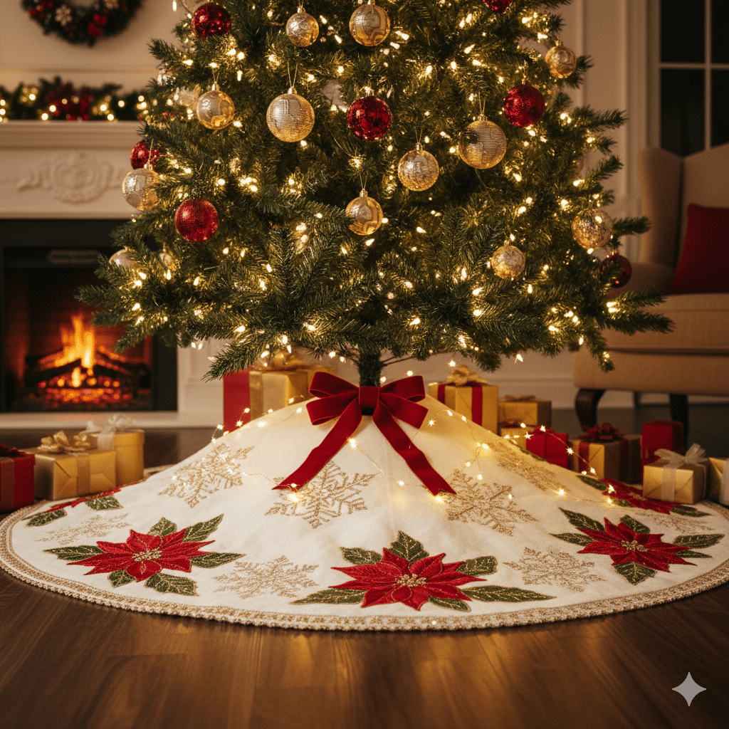 Это специальный круглый коврик с разрезом, фиксирующийся вокруг ствола. Они бывают с вышивкой, пайетками, аппликациями или классическими зимними орнаментами, позволяющими выбрать под стиль оформления елки или комнаты.