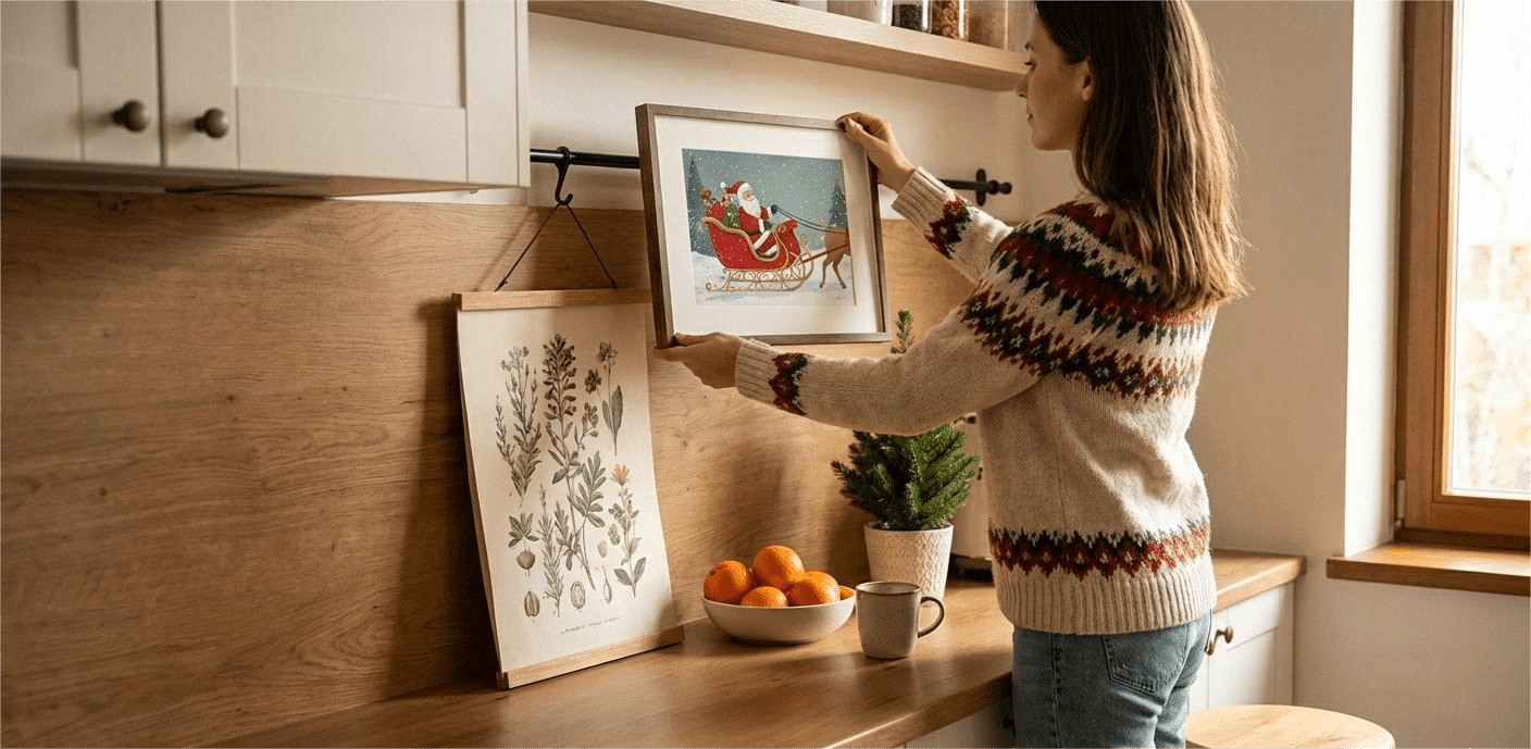 Праздничные иллюстрации или новогодние принты можно повесить даже на кухне или в ванной комнате. Это простой способ освежить интерьер без ремонта и больших затрат.