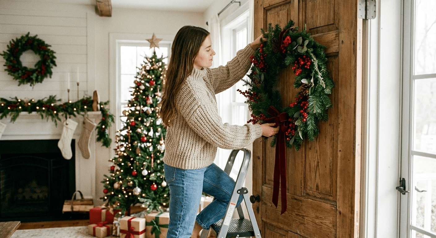 Еловые гирлянды и рождественские венки придают праздничное настроение, не занимая места. Их можно разместить на зеркалах, дверных проемах, полках или над столом. Для гармонии лучше соблюдать симметрию и повторять элементы декора.