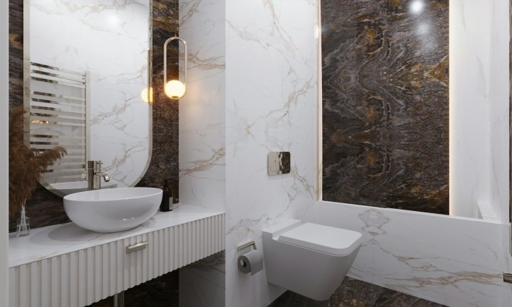 Тяжелые люстры или светильники с причудливым декором мгновенно переносят ванну в прошлое. Освещение – один из самых простых способов обновить интерьер. Лаконичные бра, подсветка зеркала или скрытый свет выглядят современно и делают пространство более легким. Особо стоит избегать рядов круглых лампочек – это решение давно утратило актуальность.