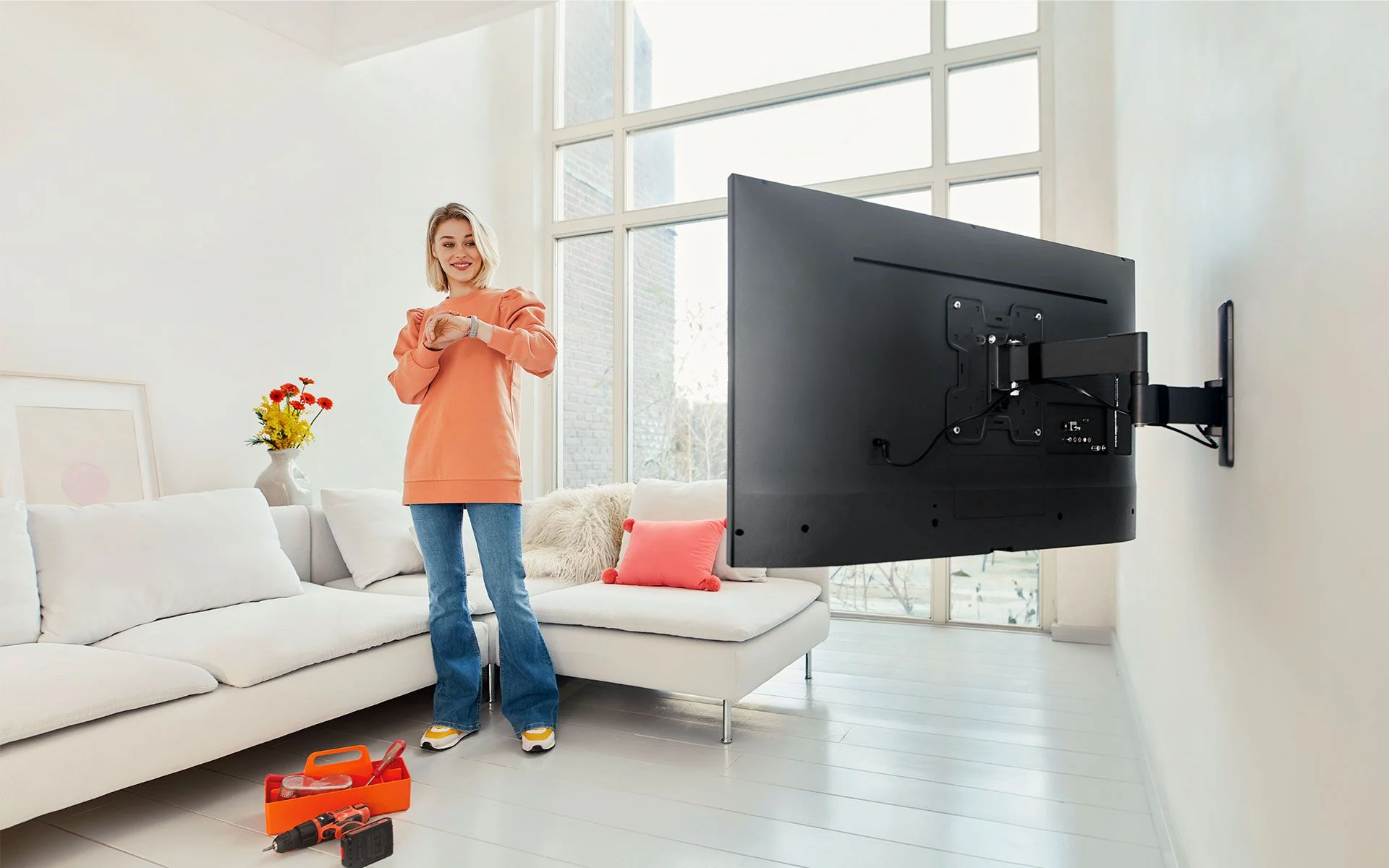 Такое решение экономит место и позволяет оставить под экраном свободное пространство. Особенно хорошо работает, если провода спрятаны в стене или аккуратно собраны.