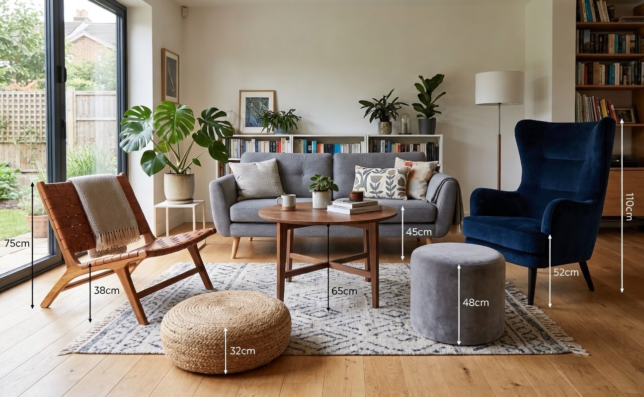 Начните с дивана – измерьте высоту его сиденья. Затем подбирайте или проверяйте кресла и пуфы: они должны вписываться в диапазоне примерно 10 см от этого значения.