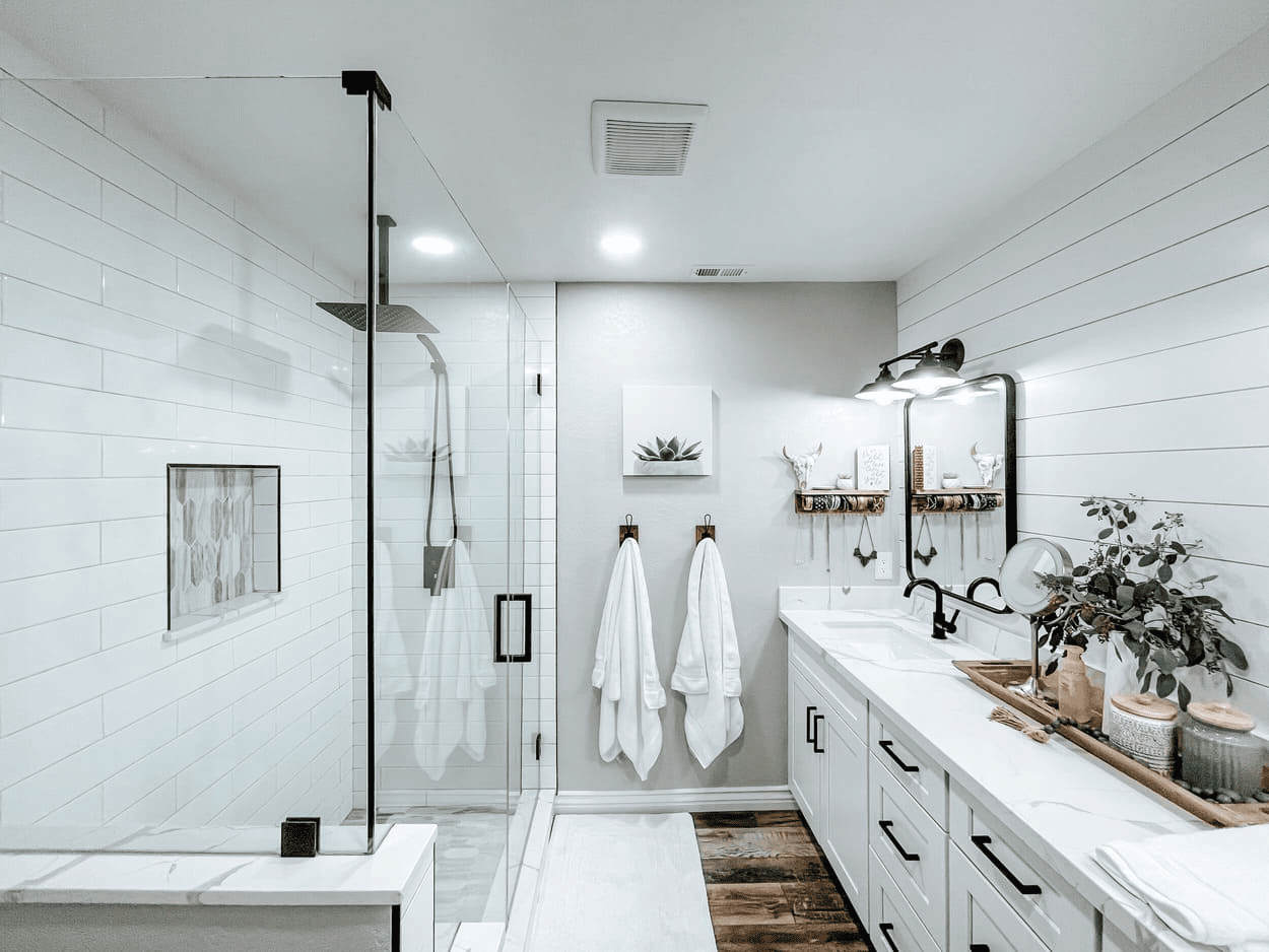 Вытяжной вентилятор – необходимость. Без него на стенах и потолке со временем появится плесень. Современные модели с датчиком влажности включаются автоматически и не нуждаются в отдельном переключателе.