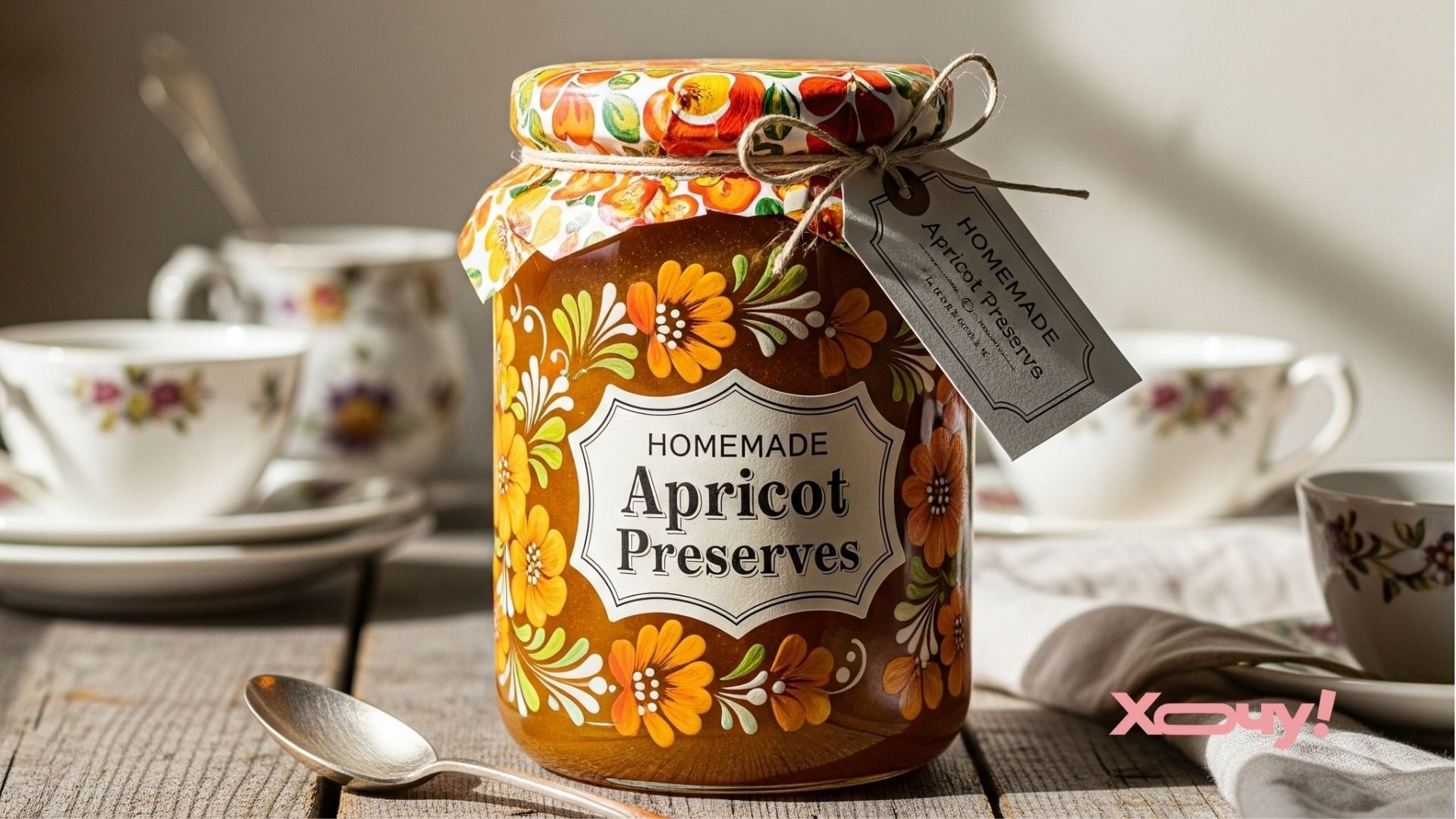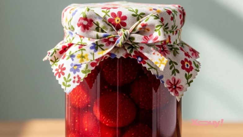 Здесь вариантов может быть множество. Можно разрисовать стекло банки красивыми узорами, наклеить наклейки или оформить крышку шапкой из ткани с бантиком, связать кружево или приобрести одинаковую подарочную бумагу и сделать все крышки одинаковыми, завязать их красивой веревкой и прицепить этикетку с названием, годом и именем хозяйки.