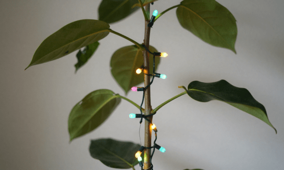 Это растение имеет толстые листья и крепкий ствол. Темно-зеленые или пестрые листья прекрасно впишется в разные рождественские цветовые гаммы. Чтобы не повредить растение, используйте легкие украшения.