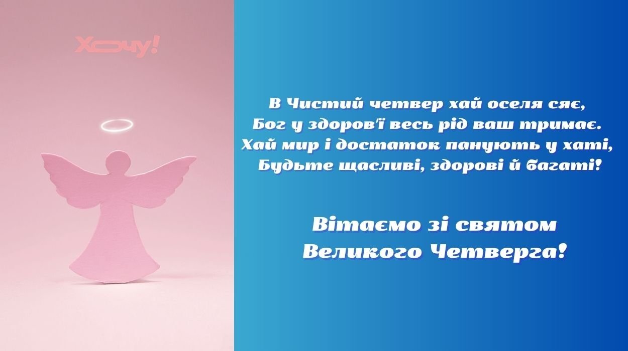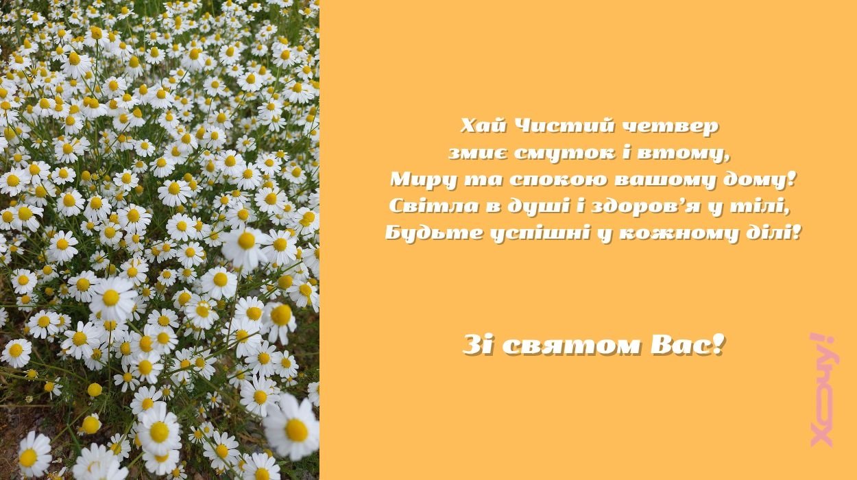 А еще в этот день стоит поздравить своих родных и близких! Мы собрали для вас самые красивые поздравления с Чистым четвергом на украинском языке, чтобы вы могли отправить своим родным красивое пожелание или картинку, или открытку к празднику. Сохраняйте себе и пересылайте тем, кого любите!