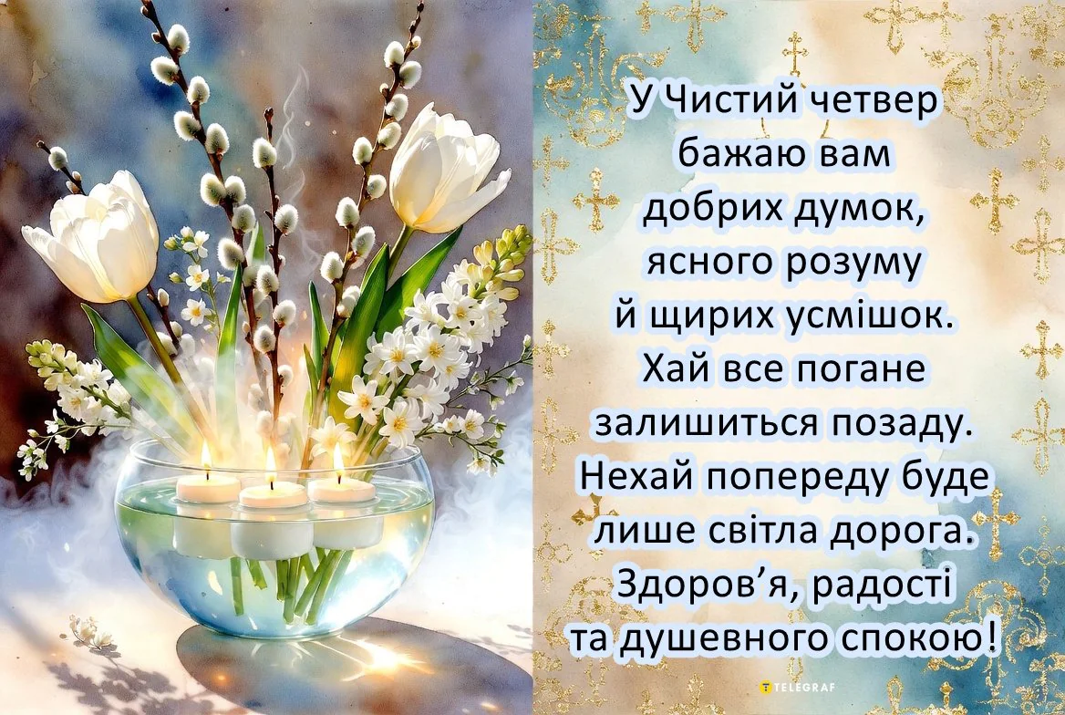 Прийміть мої найщиріші привітання з Чистим четвергом! Хай все буде так, як ви задумали, хай вас супроводжують тільки світлі думки та чисті поступки. Все буде добре!