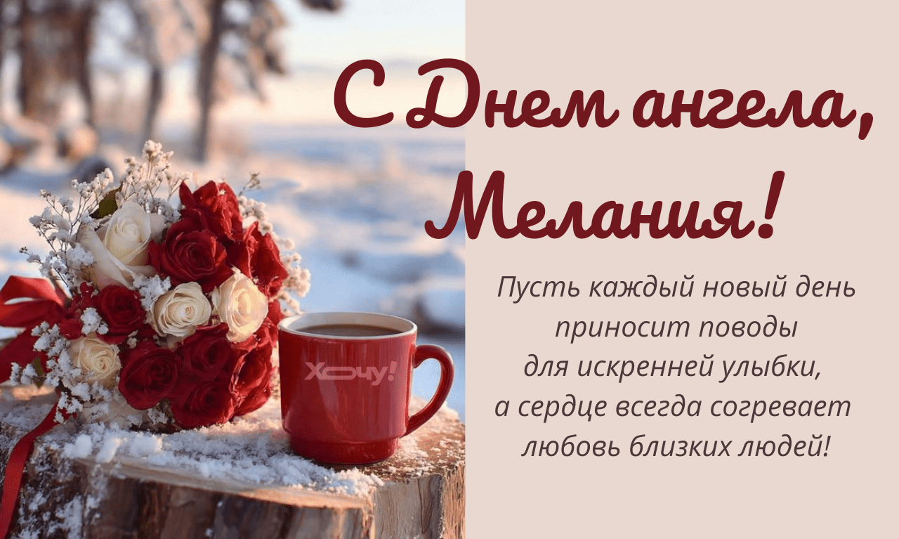 Милая Мелания! Сегодня мы празднуем твои именины. Желаем душевного тепла, благополучия и удачи. Пусть твои глаза всегда сияют светом счастья и любви! С Днем ангела!