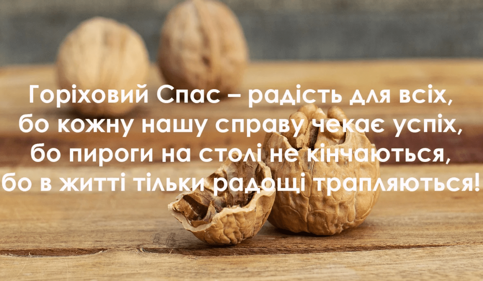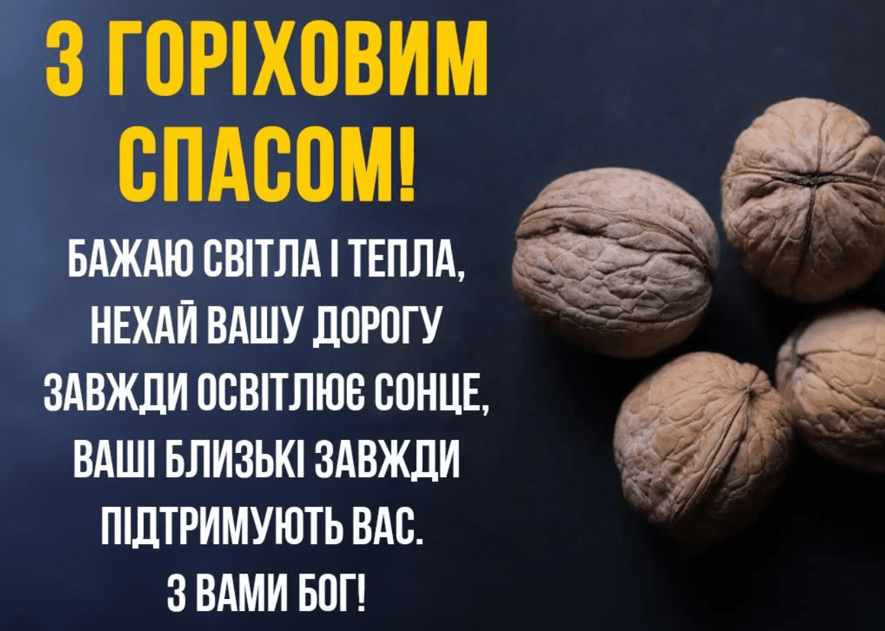 Щиро вітаю з Горіховим Спасом! Нехай це свято принесе вам благодать і радість. Бажаю, щоб ваше життя було міцним і надійним, як горіхова шкаралупа, а ваше здоров'я і щастя не знали меж. Хай буде взаєморозуміння, гармонія і любов у вашій родині.