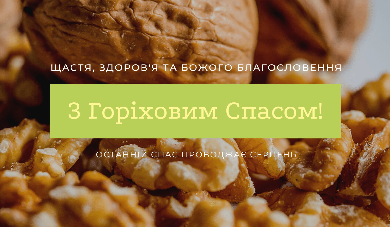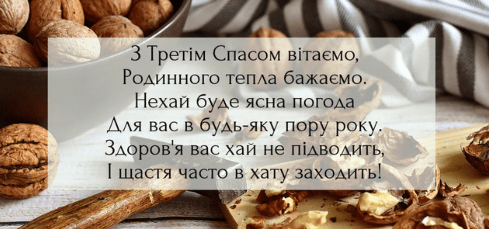 Вітаю з Горіховим Спасом. Нехай це свято принесе силу і міцну, як горіх, віру в вашу сім'ю, нехай в домі вашому панує добробут та мир. Бажаю здоров'я, благодіяння, чистоти душі та радості серця.