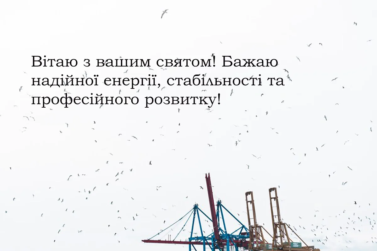 Прийміть найщиріші привітання з професійним святом! Ваша щоденна праця — це не просто робота, а запорука енергетичної стабільності, тепла та світла в кожній оселі. Ви забезпечуєте комфорт і добробут мільйонів людей, долаючи складні виклики та ризики. Нехай ваша праця завжди приносить вам задоволення, а її результати будуть гідно оцінені. Бажаємо вам міцного здоров'я, невичерпної енергії, нових професійних досягнень та особистих перемог. Нехай у ваших сім’ях панують мир, злагода і достаток.