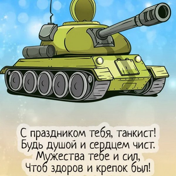 Поздравляю с Днем танкиста. Желаю крепких нервов, как гусеницы. Желаю полной осмотрительности в жизни, как в башне. Желаю надежной любви, как броня! Будь смелым, сильным, мудрым, неутомимым и непобедимым. И помни: танки грязи не боятся, а танкисты не боятся вообще ничего! Желаю успехов и геройских поступков, венчающихся победой!