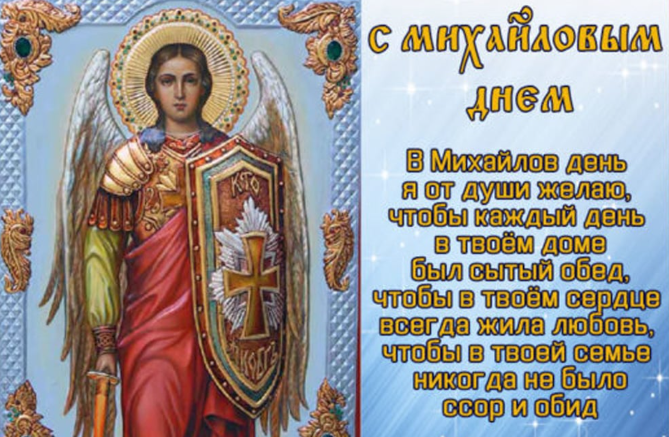 Поздравляю с одним из самых чистых и светлых праздников — Михайловым днем. Пусть этот день принесет радость, смирение, спокойствие и добро и окутает ими весь мир. Пусть помыслы и поступки будут чисты, как родниковая вода, а любовь и принятие воцарится в сердце каждого.