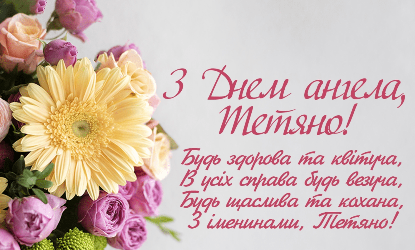 У твої іменини, Тетянко, бажаю ніколи не відступати від мети, вірити у свої сили, відчувати підтримку близьких і фінансовий достаток. Нехай твоя небесна покровителька допомагає в усіх справах!
