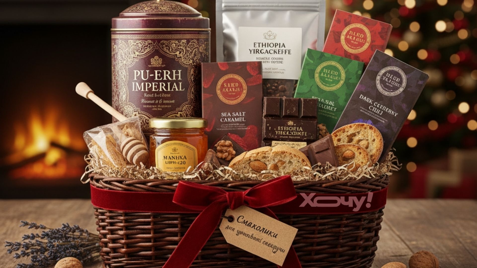 • Корзина элитных вкусностей. Редкий чай, качественный кофе, крафтовый шоколад, баночка дорогого меда.