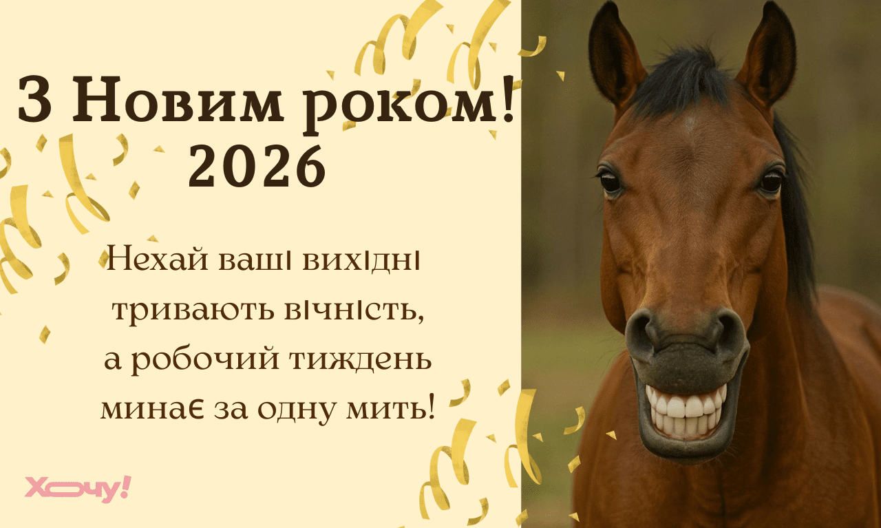 Нехай рік Коня 2026 принесе вам мудрість не відповідати на робочі повідомлення після шостої вечора. Бажаю, щоб креативність била ключем, а всі "баги" в житті виправлялися самі собою без залучення технічної підтримки. Нехай ваші вихідні тривають вічність, а робочий тиждень минає за одну мить!
