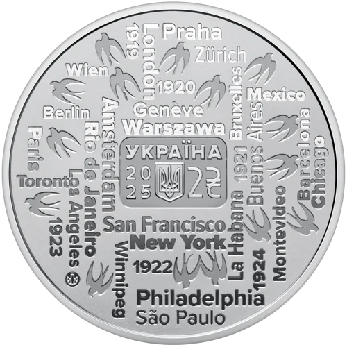 На реверсе – стилизованный портрет Кошица, особое внимание уделено его рукам, ведь именно они были главным инструментом дирижера. Флом композиции стала динамическая волнистая поверхность, которая расходится от герба УНР, подчеркивая идею культурного влияния на мир.