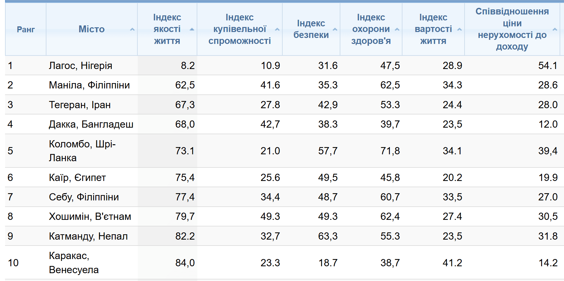 Последнее место в новом рейтинге занимает город Лагос в Нигерии. Он демонстрирует уникально низкий общий балл по сравнению со всеми другими городами из списка.