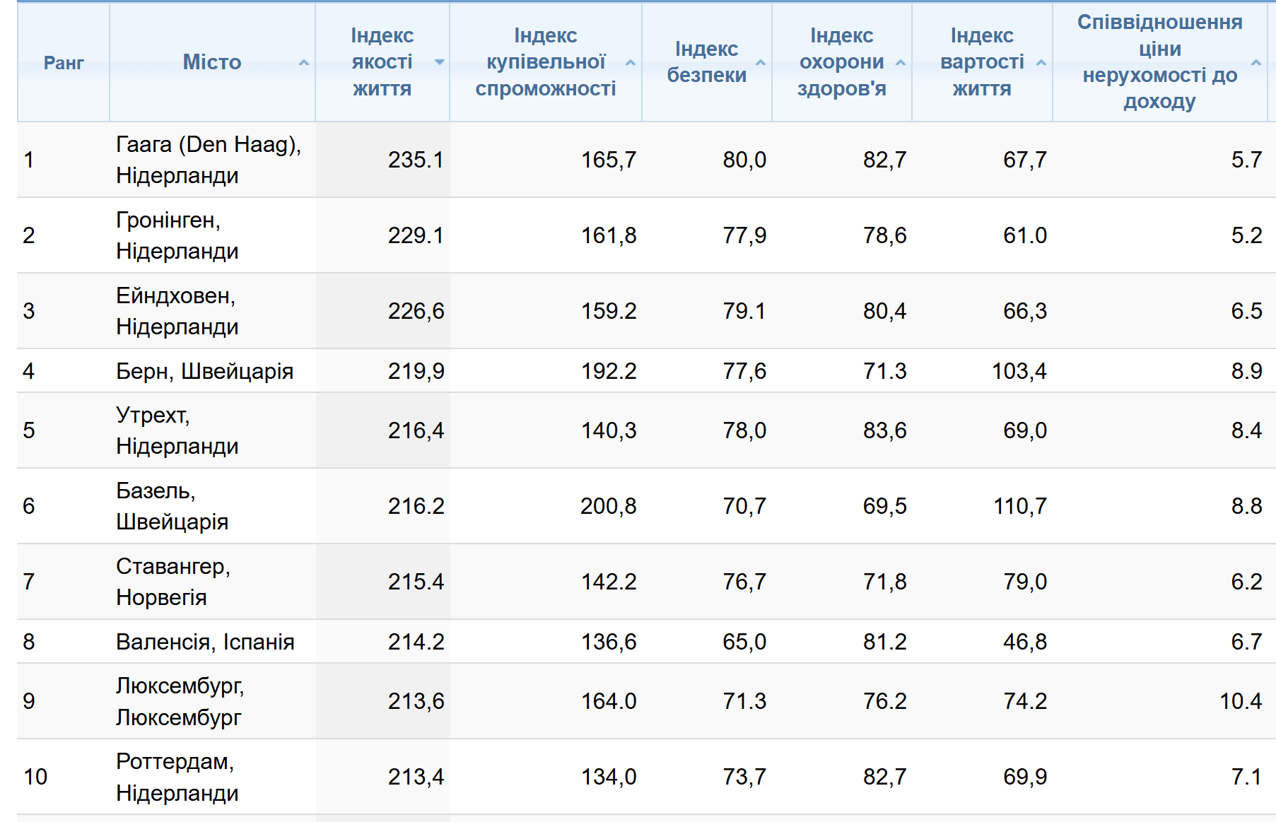 Согласно свежим данным Numbeo (информация за первые 6 месяцев 2025 года — ред.), самыми комфортными для проживания городами мира стали преимущественно нидерландские и швейцарские города. На первом месте — нидерландская Гаага, вторую строчку занял также нидерландский Гронинген, а на третьей позиции в рейтинге — опять же, нидерландский город Эйндховен.
