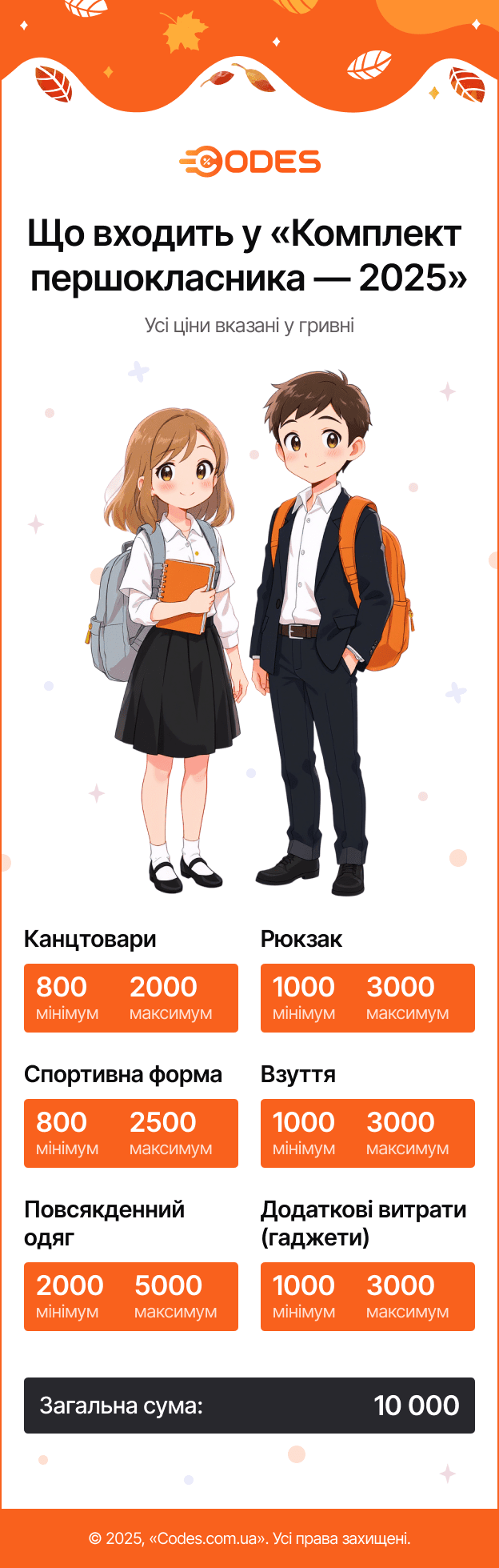 Эксперты codes.com.ua перед стартом учебного года провели анализ ситуации и решили сразу поделиться своими выводами. Надеемся, это поможет родителям собрать школьников с минимальными затратами и отпраздновать День знаний 2025 в хорошем настроении (и, что не менее важно, не с пустыми карманами)!