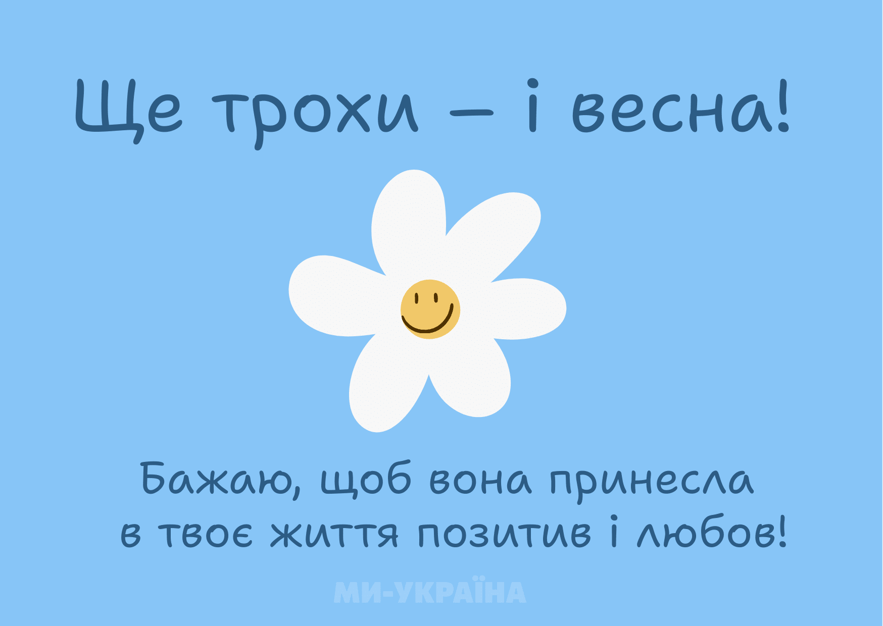 Зима — все! Ще зовсім трохи — і весна! Бажаю, аби вона принесла у твоє життя позитивні зміни, багато радості та натхнення, а ще — здійснила твою давню мрію!