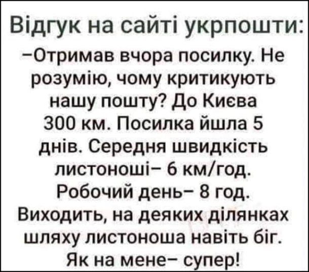 Мы собрали лучшие мемы, приколы и анекдоты об отчаянных почтальонах, таинственном исчезновении посылок и о том, как почта, кажется, иногда действительно полагается на арендованных голубей. Итак, ловите шутки о почте и знаменитой "мгновенной" доставке от двух крупнейших лидеров на рынке доставок — Укрпочты и Новой почты, которые являются бесконечным источником для юмора.
