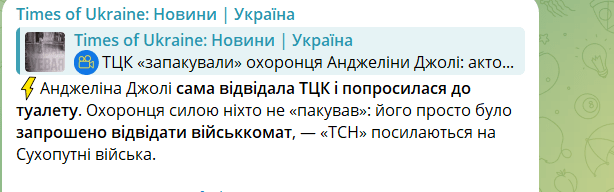 ТЦК остановили кортеж Анджелины Джоли на блокпосте, а именно — 2 первых крупных джипа. У одного мужчины оказались какие-то проблемы с документами. Пока решались вопросы — в здание лично вошла самая голливудская звезда, что сразу породило забавные комментарии и мемы.