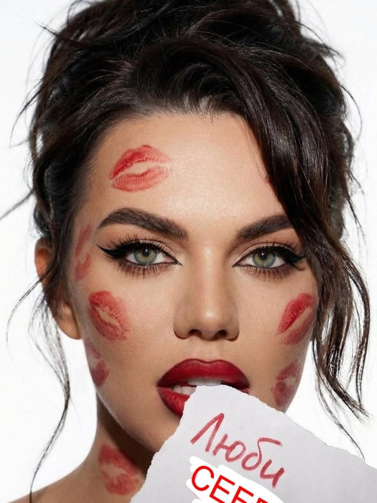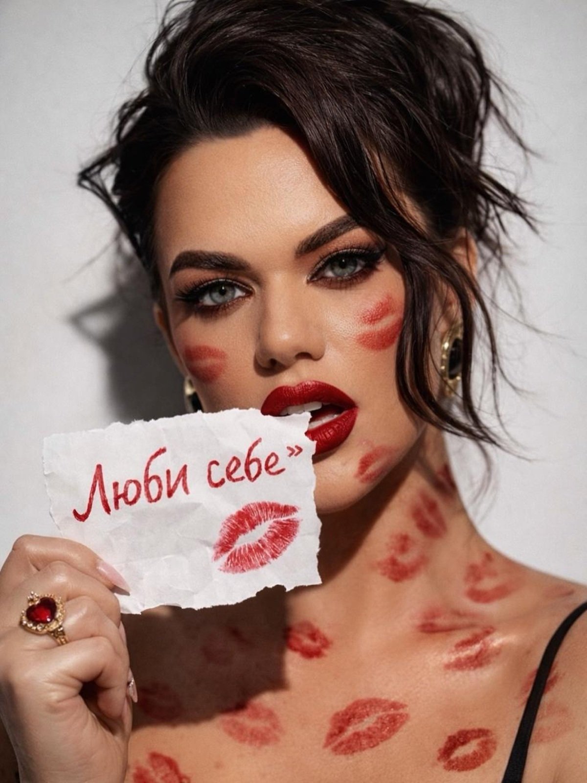 Хаотичные следы поцелуя с красной помадой на лице, шее, плечах. Золотое кольцо с большим красным сердцем и бриллиантом. Замени лицо на мое, используя ссылку. Не меняй идентичность лица.