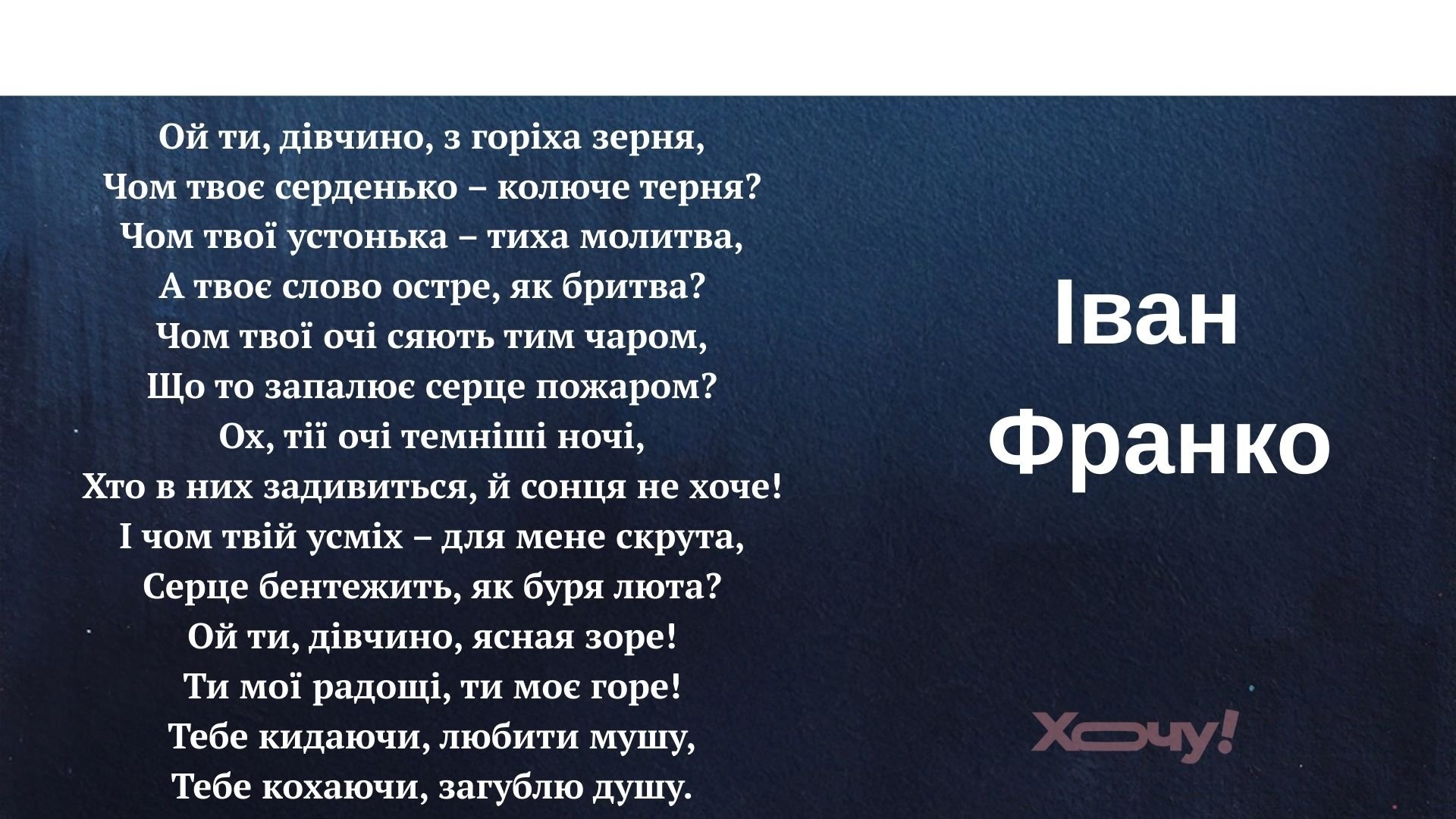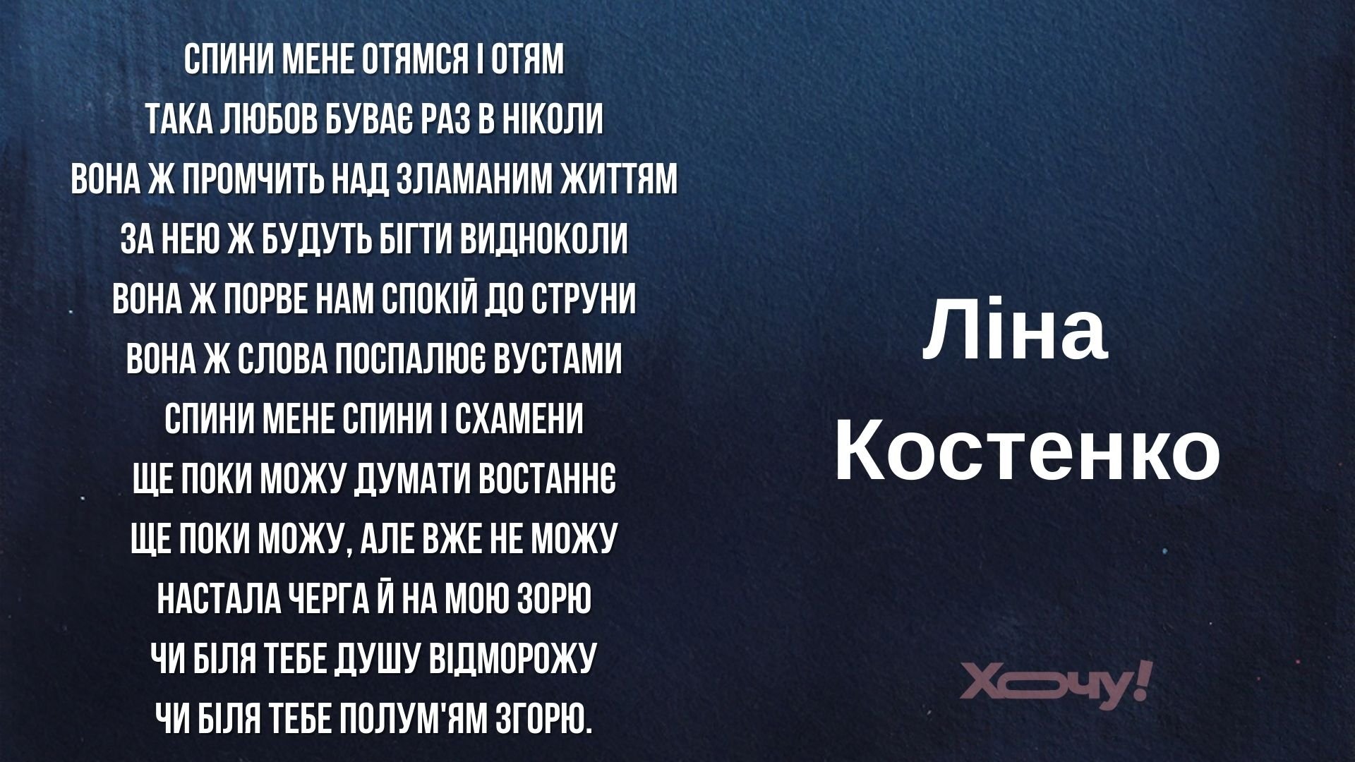 Произведения украинских поэтов уже давно переводят на десятки языков, цитируют со сцен мировых театров, запечатывают в виде муралов на улицах европейских городов и кладут на музыку, покоряющую мировые чарты. "Хочу!" оставляет вам поэтические шедевры, которые доказывают, что украинское слово непобедимо.