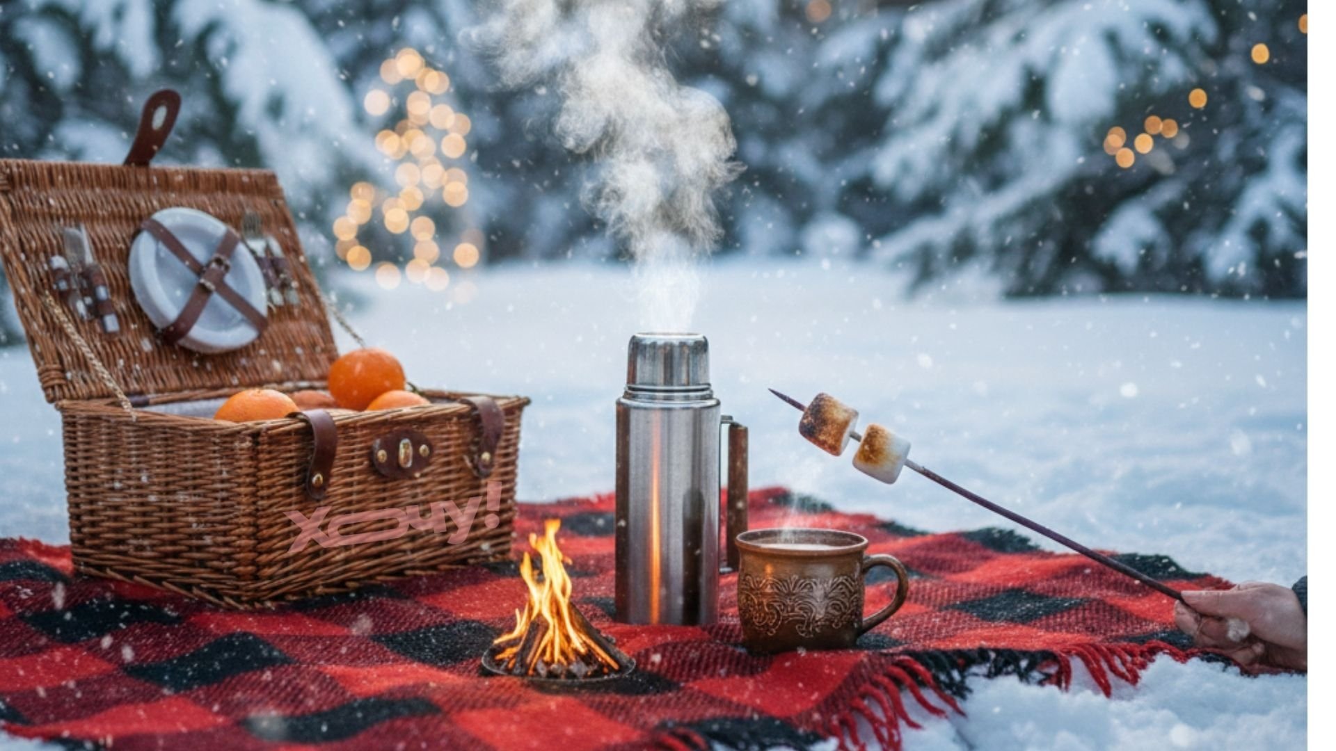 Реквизит: Теплый плед в клетку, термос с горячим чаем, керамическая чашка, маршмеллоу и, возможно, корзина с мандаринами.