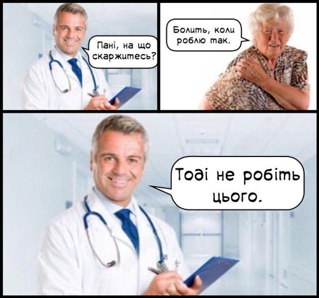 Жалобы пациента: — Доктор, у меня все болит! Куда пальцем не ткну — всюду боль: в колене болит, в животе болит, в голове болит... Врач «скорой» после осмотра: — Голубчик, так у вас просто палец сломан!