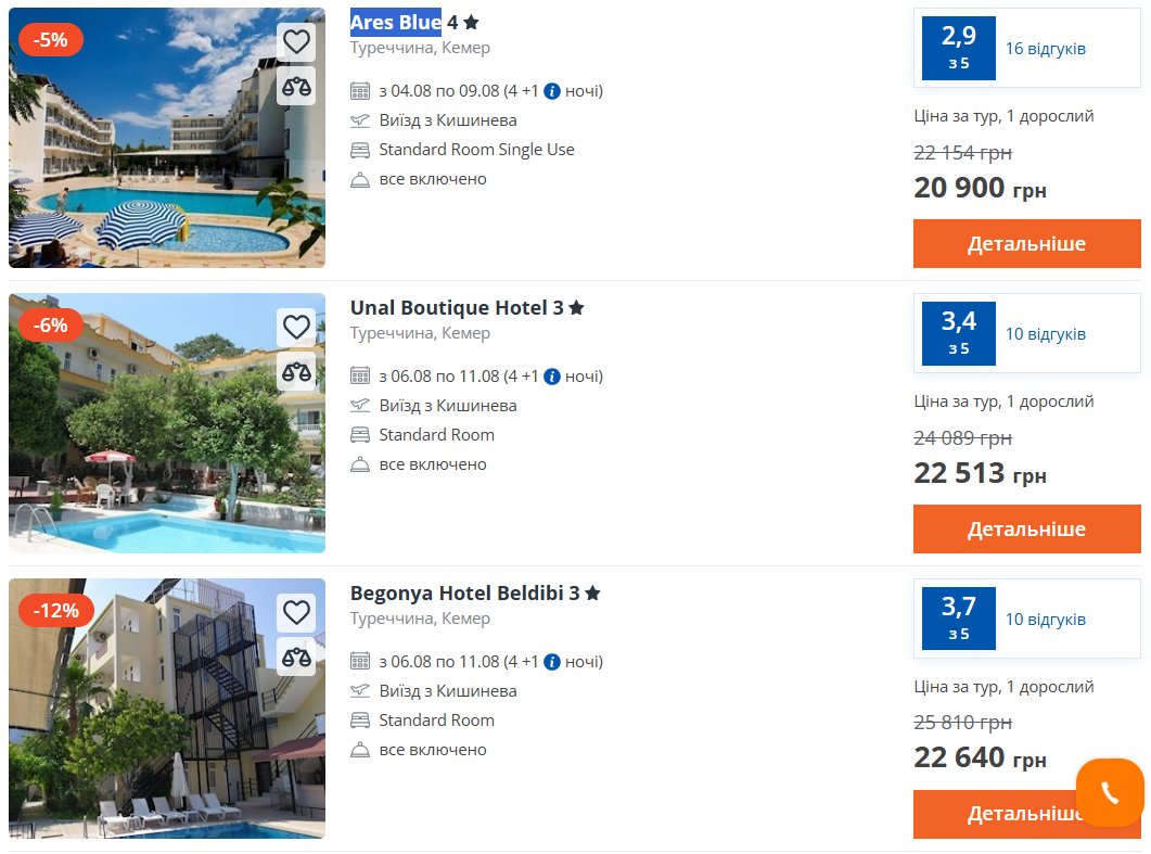 Турция до сих пор остается достаточно бюджетным направлением, где можно найти курорты на разный кошелек. К примеру, путевка на 4 дня в четырехзвездочном отеле Ares Blue (Кемер) обойдется всего в 20900 грн.