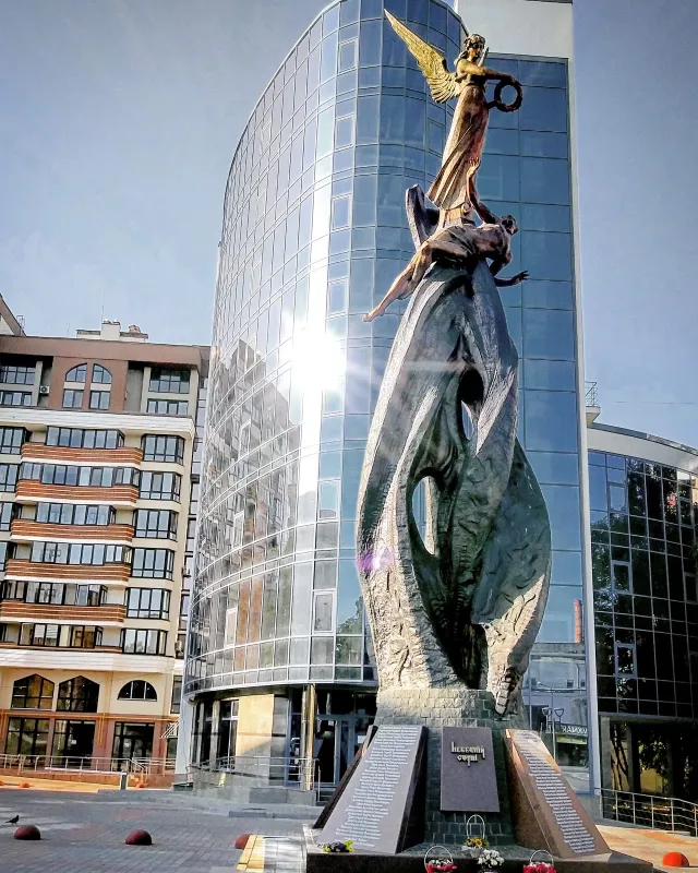 Скульптура высотой 9 метров открыта в 2016 году. Композиция изображает юношу (символ невинной жертвы) в вихре огня и ангела, поднимающего его душу к небу. Материалы – бронза и гранит.