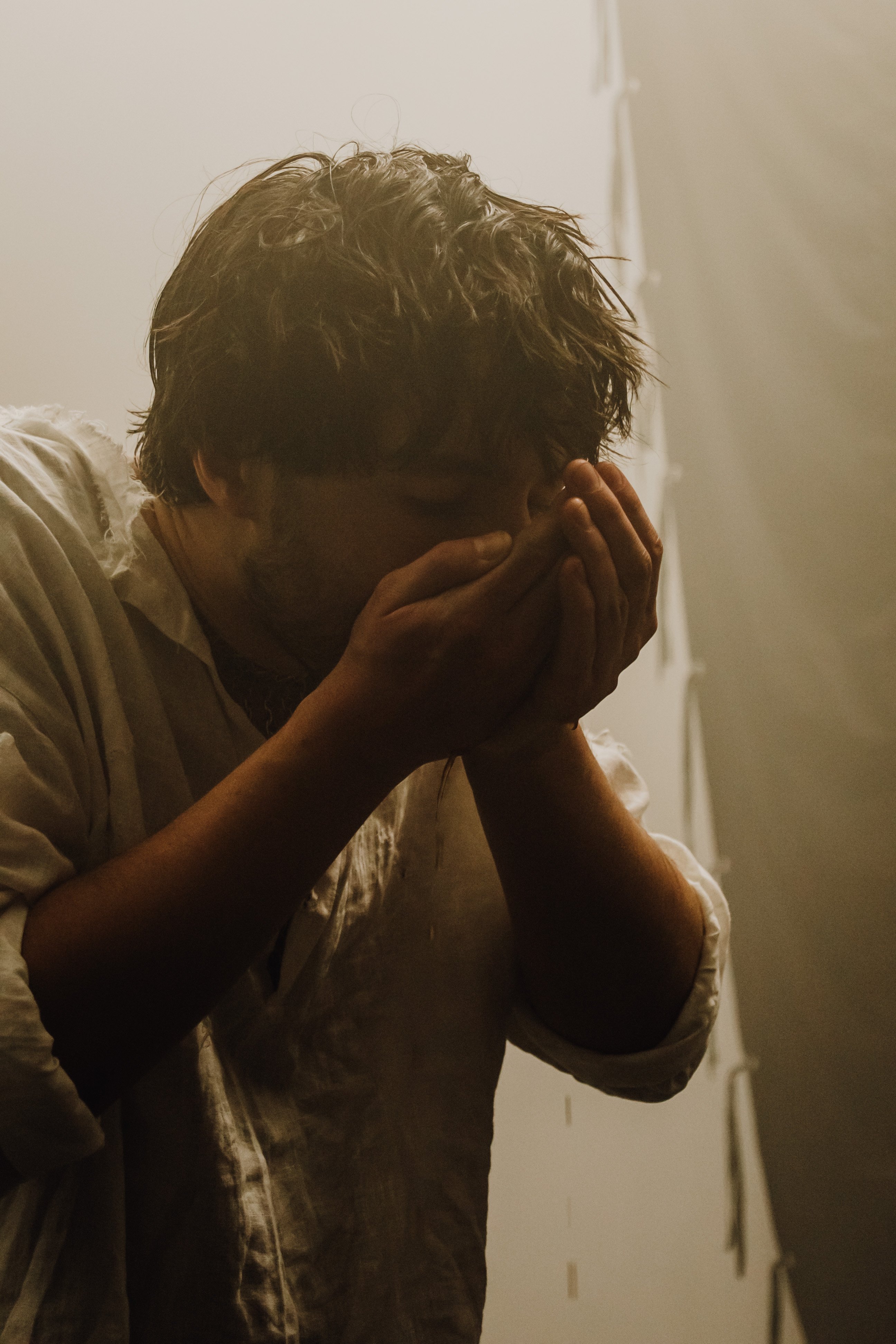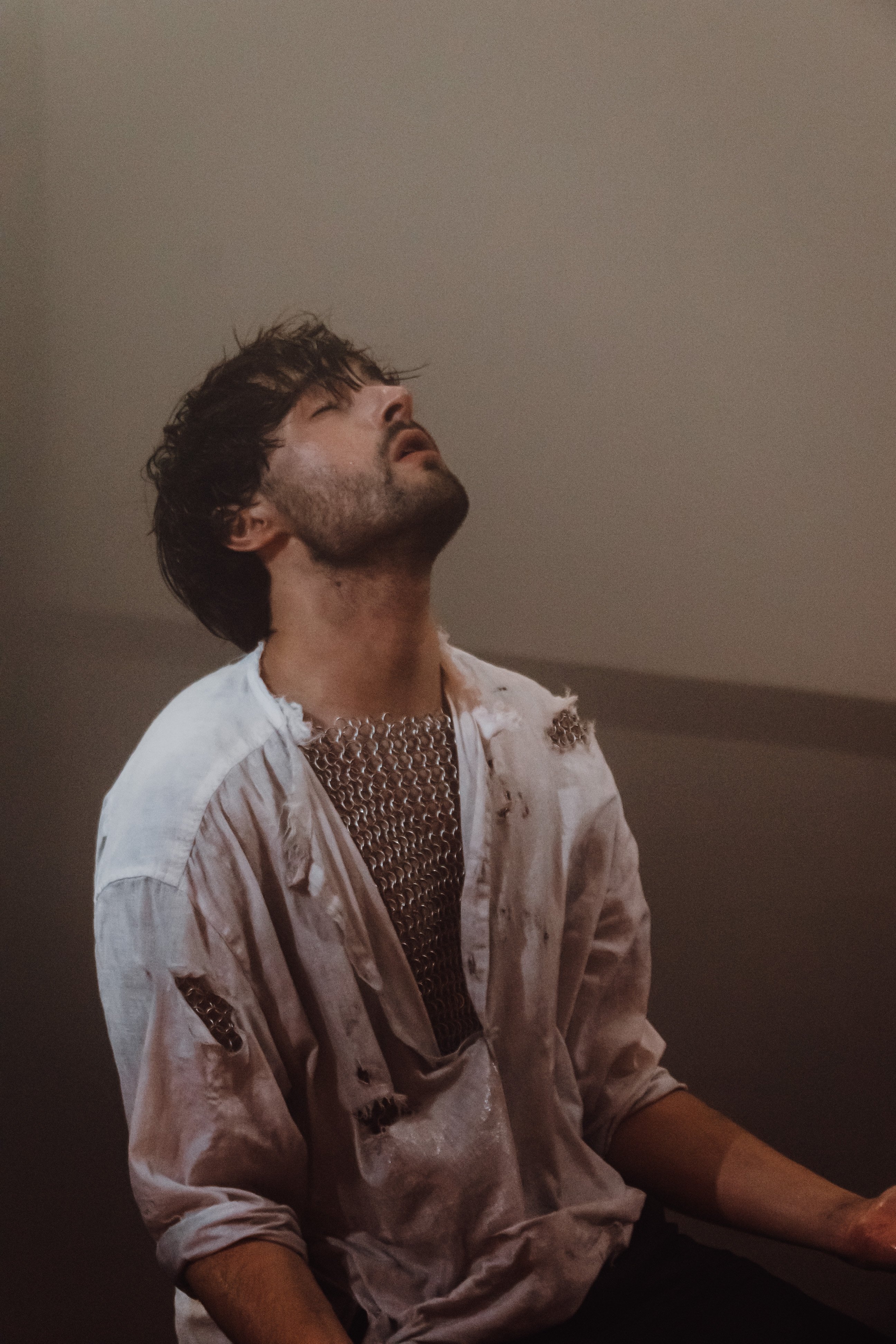 Артист показал фото из клипа. На них KHAYAT предстает в светлой разорванной рубашке, под которой видна кольчуга. Его взгляд устремлен вверх, глаза закрыты — образ передает внутреннюю борьбу и напряженное эмоциональное состояние.