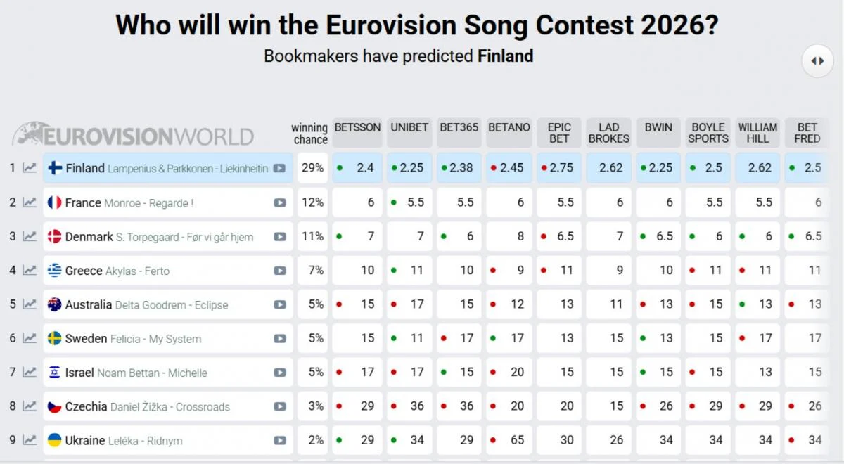 Евровидение 2026: букмекеры назвали фаворитов и котировки для Украины