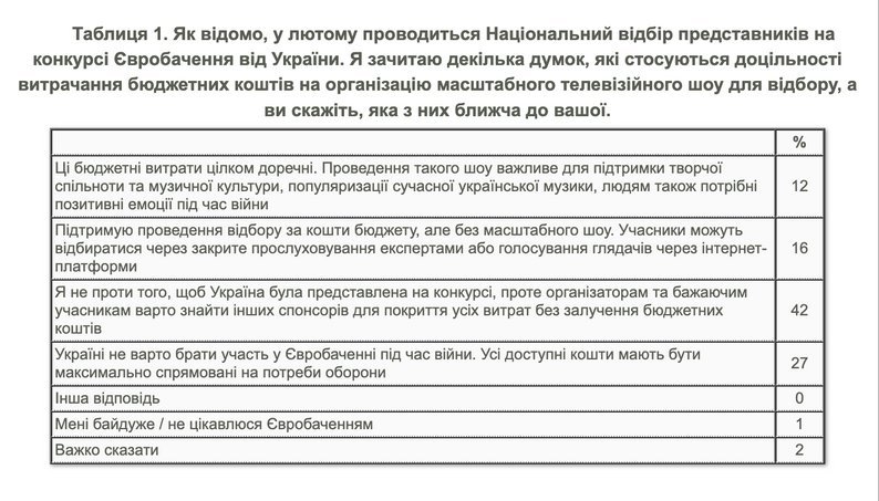 По данным Киевского международного института социологии, 70% украинцев либо поддерживают, либо не возражают против участия страны в конкурсе. В то же время 27% убеждены: во время войны это не ко времени, и ресурсы следует направлять на другие нужды.