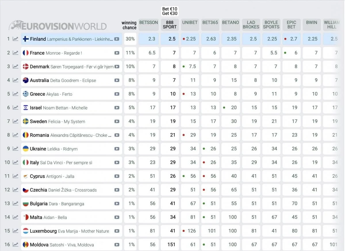 Букмекеры также фиксируют стабильное лидерство Финляндии, на втором месте уходит Франция, на третьем – Дания. Страны уверенно держатся в верхушке прогнозов. Украина готовится к выступлению во втором полуфинале 14 мая, где LELEKA выйдет на сцену под номером 12 и попытается изменить динамику ставок в свою пользу.