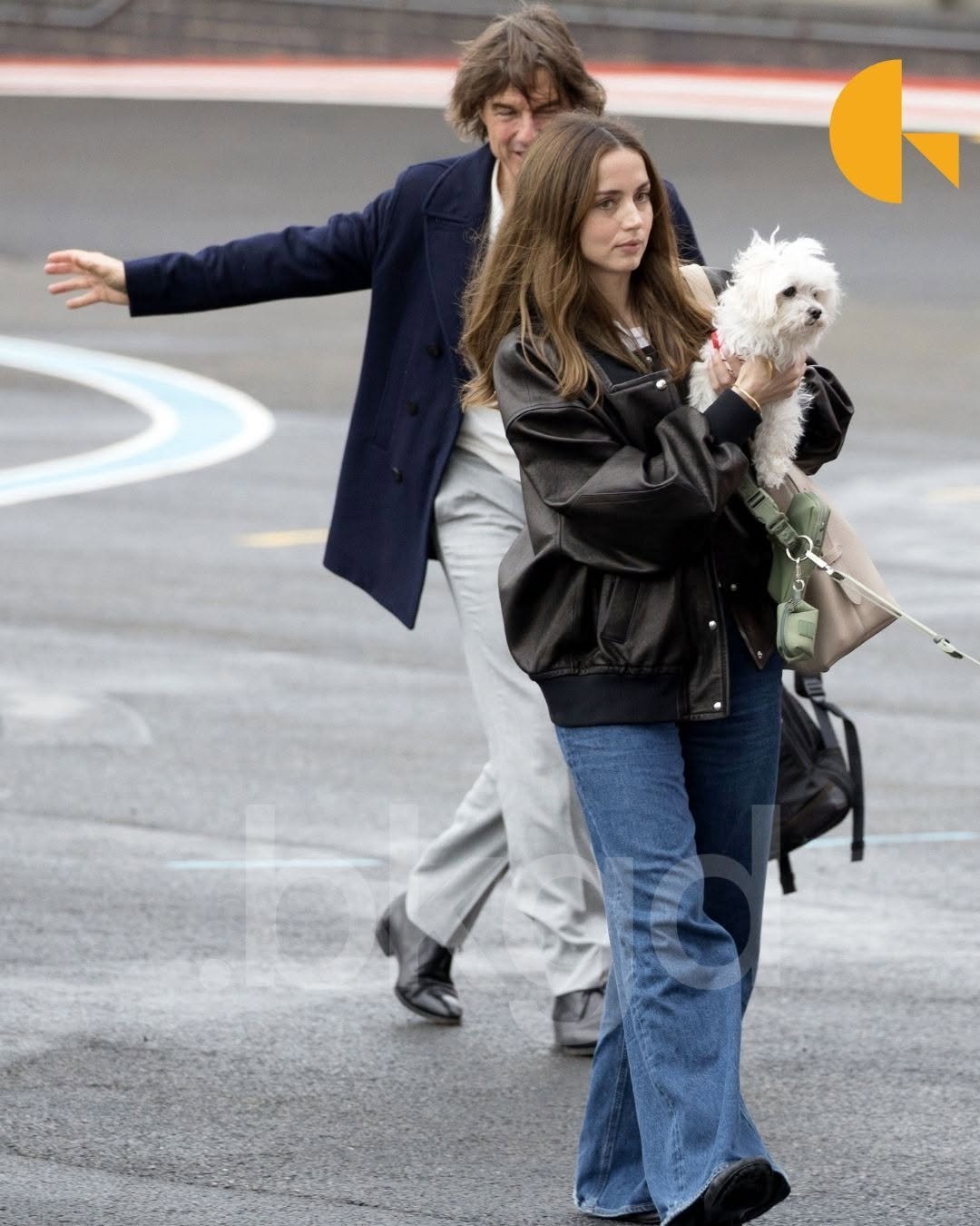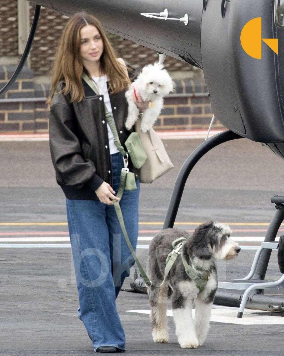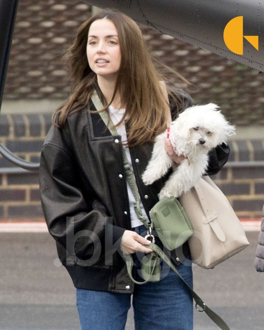 Де Армас прекрасно выглядела в синих джинсах и белой футболке, поверх которой надела кожаную куртку. Дополнили образ светлая сумка и темная обувь. Одной рукой она держала у груди собаку по кличке Элвис, а пес Сальса шел рядом на поводке "свободные руки".