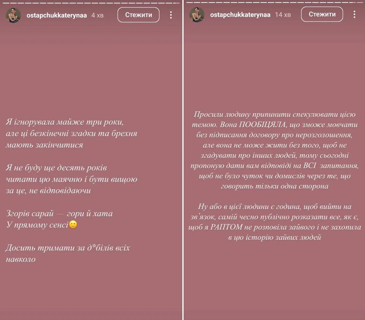 По словам Екатерины Остапчук, бывшая жена шоумена нарушила договоренности, когда стала публично говорить о разделе общего имущества. Именно поэтому блоггер решила не молчать и рассказала свою версию финансовых вопросов после развода Остапчука с Гирняком.