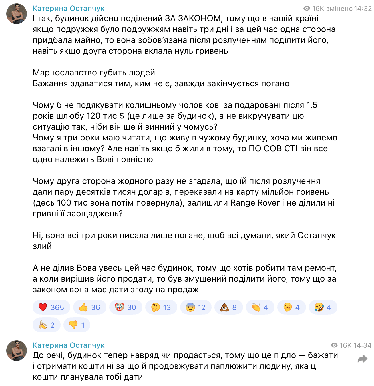 Ранее бывшая жена Владимира Остапчука публично сообщила, что они наконец-то выставили на продажу общий дом, который приобрели за время брака. Впрочем, на это отреагировала третья жена шоумена, блоггер Екатерина Полтавская. Для того, чтобы рассказать всю правду, она даже создала отдельный Телеграмм-канал.