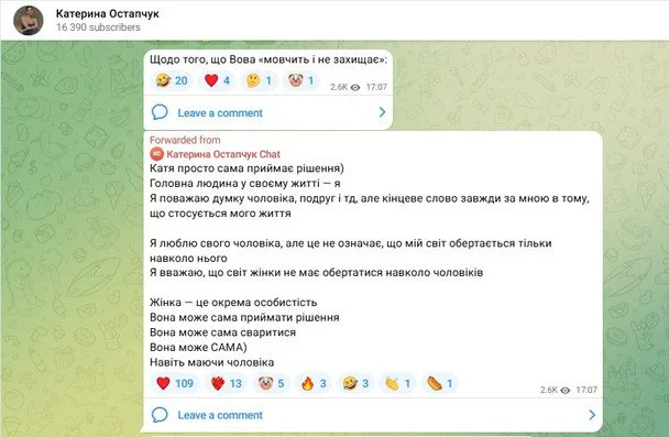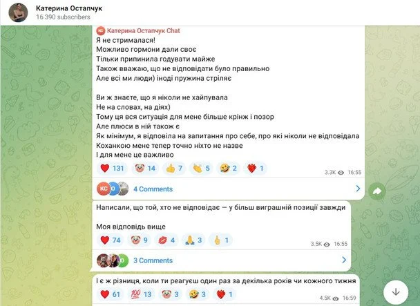 В то же время блогер признала, что ее эмоциональные высказывания в адрес Горняк были слишком резкими. Екатерина Остапчук отметила, что не стоило разжигать скандал и что ее поведение могли частично повлечь гормональные изменения после завершения грудного вскармливания.