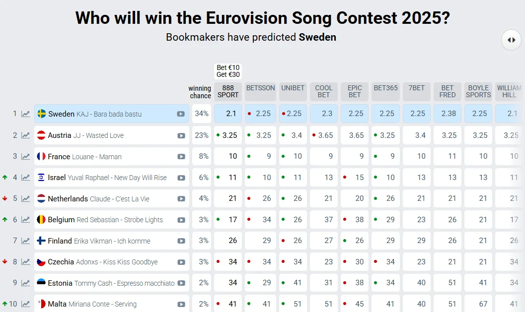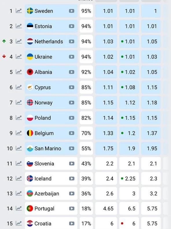 Следует отметить, что в последнее время букмекерские конторы фиксируют незначительные изменения в своих прогнозах. Лидирующая тройка остается неизменной: Швеция сохраняет первую позицию с 34% вероятности победы, за ней следует Австрия с 23%, а третье место занимает Франция с 8% шансов на триумф.