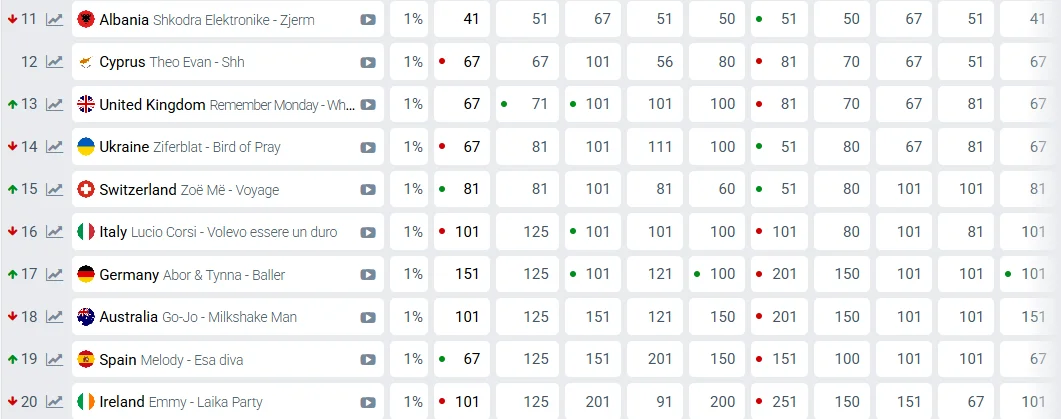 Согласно последним данным сервиса Odds Eurovision, безоговорочным лидером остается Швеция. При этом Украина потеряла одну строчку в таблице и занимает 14 место среди стран-участниц. Согласно последним данным букмекеров, шансы на победу составляют всего 1%. До этого Украина держалась на 13-м месте.