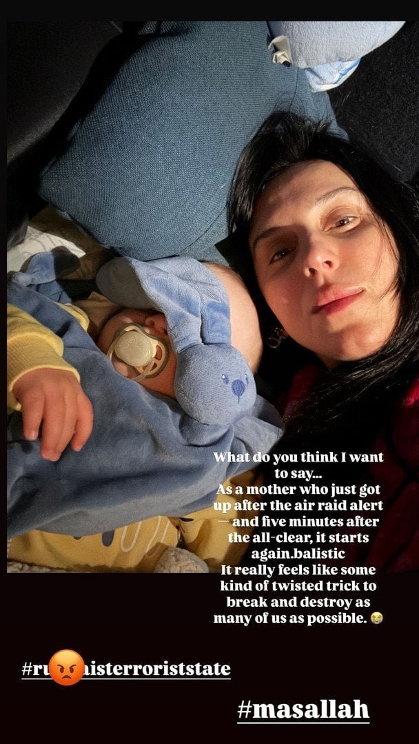 Пока столицу накрывала очередная волна террора, артистка делала все возможное, чтобы уберечь жизнь маленького сына Алима. Российские силы атаковали Украину с новой жестокостью. Все началось с "шахедов", от которых ее семья пряталась ночью, а после столицу атаковали баллистическими ракетами.