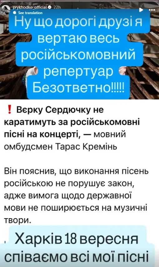Артистка упомянула также другие примеры с музыкальной сцены, отметив, что известные российские исполнители или их песни не запрещены в Украине. Кстати, раньше Приходько критиковала тех украинских артистов, которые переводят свои старые хиты на украинский вместо создания нового контента.