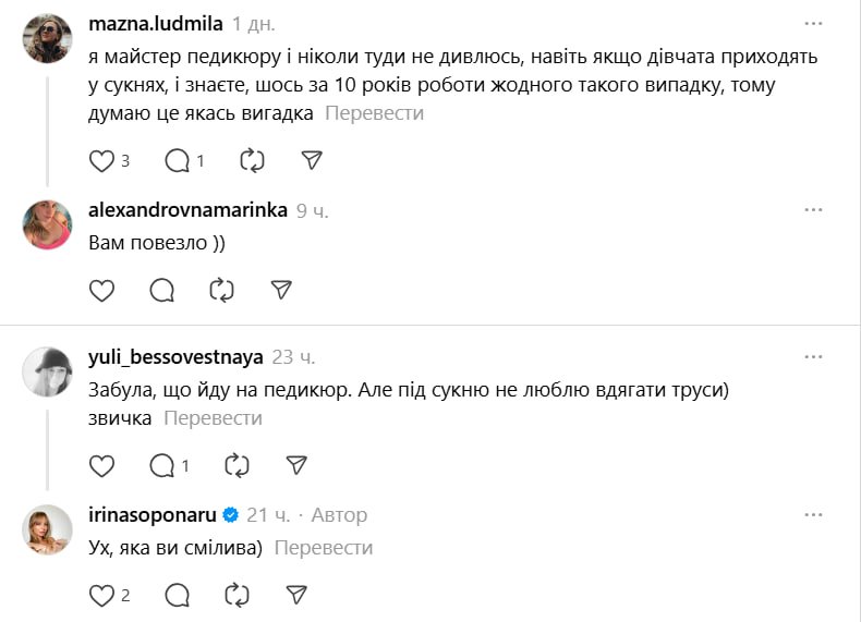 Ирина заинтересованно обратилась к подписницам с вопросом, случалось ли им поступать так же, и выразила искреннее непонимание подобного поведения. Сопунару призналась, что просмотрела ролик мастерицы педикюра, которая прямо призвала девушек не забывать одевать белье перед визитом.