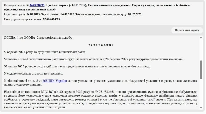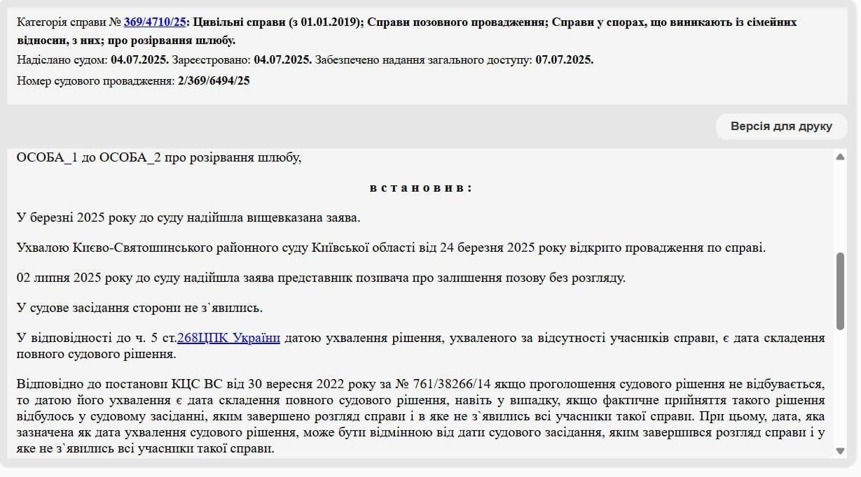 Согласно информации из реестра судебных решений, Киево-Святошинский районный суд оставил его заявление без рассмотрения 7 июля. Как оказалось, причиной стало то, что представитель Илоны попросил не рассматривать иск, и эта просьба поступила за два дня до назначенного заседания. При этом ни Гвоздева, ни ее муж не явились на слушание 4 июля.