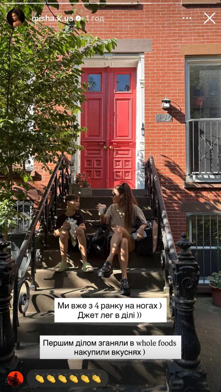 Прибыв в Нью-Йорк, актриса первым делом отправилась с сыном за вкусностями. Они наслаждались лакомством, сидя на лестнице типичного американского дома, словно из кинофильмов. Несмотря на то, что оба проснулись в четыре утра из-за смены часовых поясов, настроение у них было приподнятое.